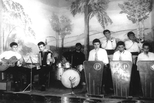 Ученически оркестър към Текстилен техникум – Габрово (1963). Снимката е от танцов клуб "Неспокойна младост". Музиканти: китара (името не се помни), акордеон Любен Глушков, барабани Иван Йорданов (Тремолото), саксофони Димо Георгиев и Илко Илиев (ръководител), Любен Боев (Упето),тромпети Христо Глушков и Христо Василев (Майчето). Изображение: Архив на Илко Илиев
